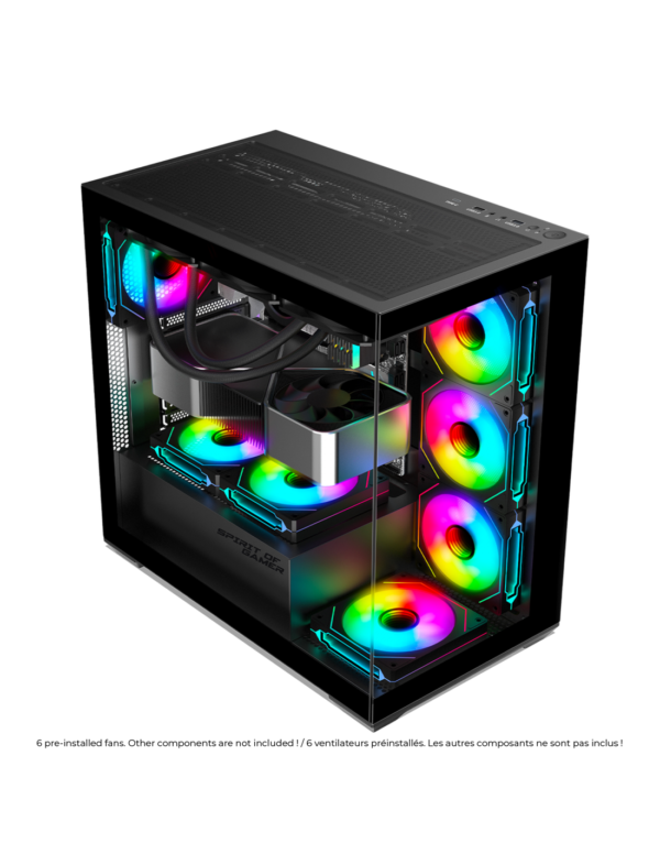 Livré avec 6 ventilateurs 120 mm ARGB pré-installés et compatible avec les contrôleurs RGB Spirit of Gamer (60 modes, 6 ventilateurs max), il offre une personnalisation lumineuse totale. Pour les configurations extrêmes, il supporte des systèmes AIO jusqu’à 360 mm en haut, 240 mm en paroi et 120 mm à l’arrière. Son châssis en acier SPCC 0,6 mm et sa gestion des câbles de 3,3 cm garantissent une installation propre et durable.