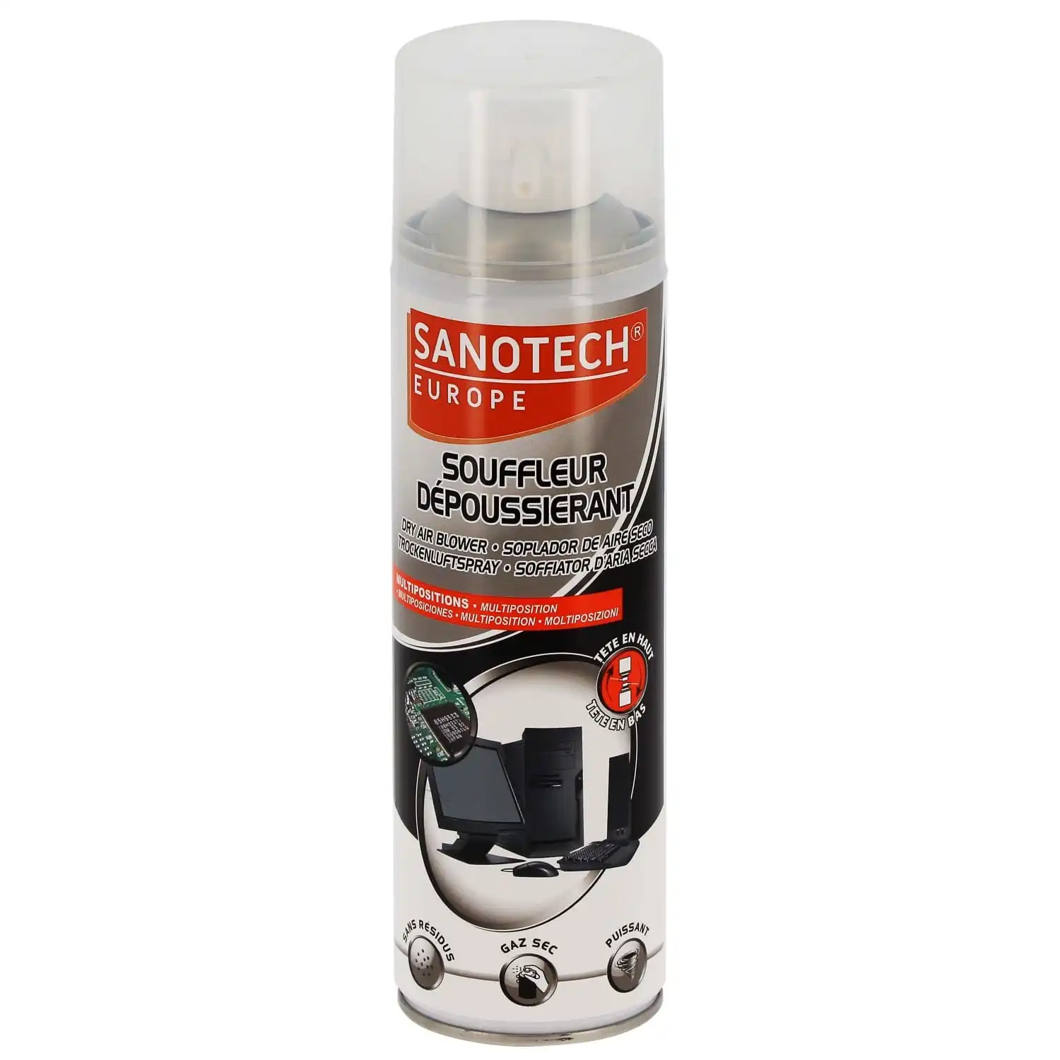 SANOTECH 500 ml – Aérosol d’air sec avec tube prolongateur. Idéal pour le nettoyage du matériel informatique, des imprimantes et des équipements de bureau. Utilisable dans toutes les positions, sans risque d’inflammation.