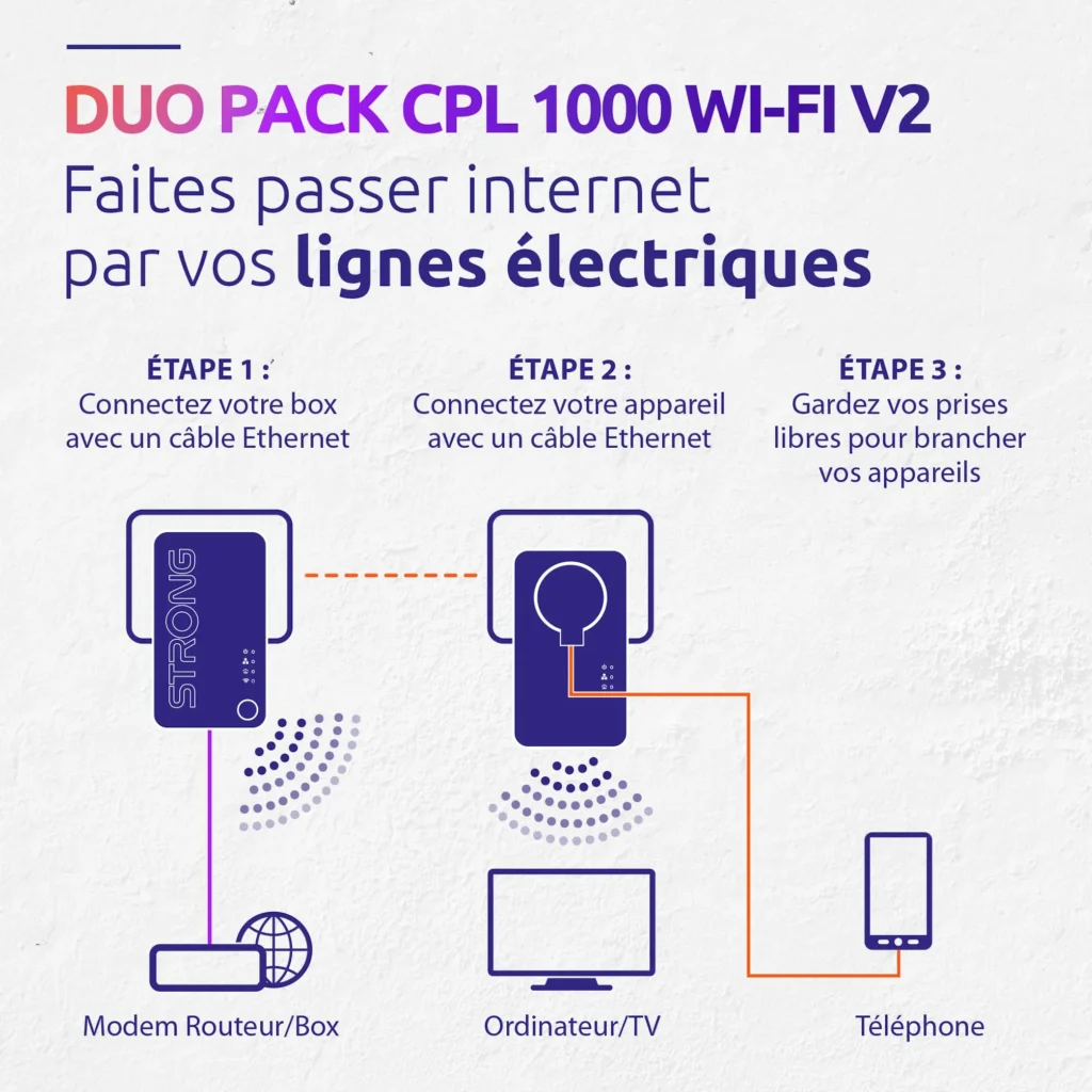 Le STRONG CPL 1000 Duo Wi-Fi FR V2 est un kit de 2 adaptateurs CPL qui transforme votre réseau électrique en réseau haut débit avec point d’accès Wi-Fi intégré. Il comprend 1 adaptateur CPL 1000 (émetteur, à brancher sur votre box) et 1 adaptateur CPL Wi-Fi 1000 (récepteur, avec Wi-Fi AC1200 bi-bande) pour créer un hotspot Wi-Fi dans la pièce de votre choix.