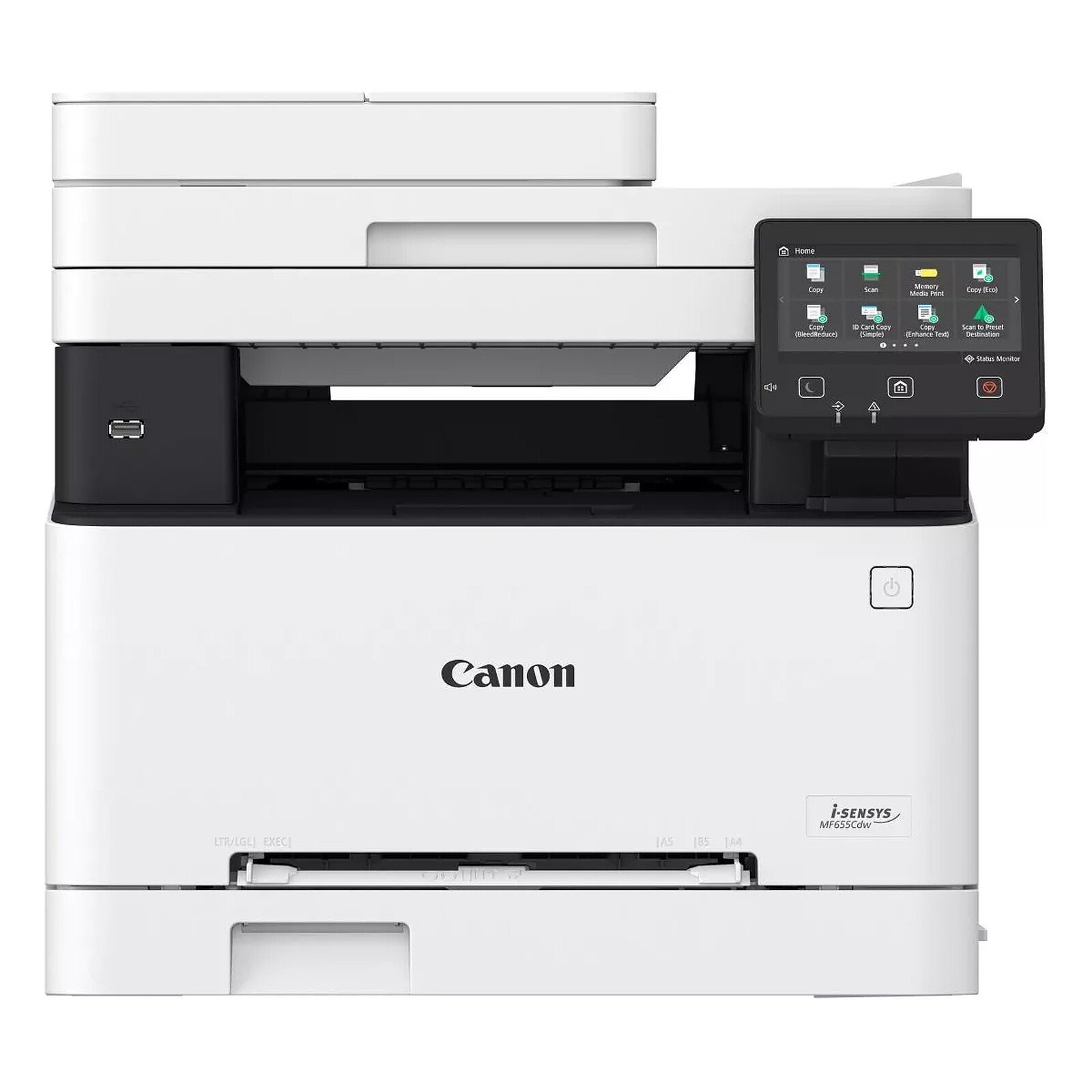 L’imprimante Canon i-SENSYS MF655Cdw dispose d’un écran tactile couleur LCD 12,7 cm pour navigation intuitive. Chargeur automatique de documents (CAD) 50 feuilles pour traiter documents multipages. Cassette 250 feuilles + alimentation manuelle. Connectivité complète : WiFi 802.11b/g/n, Ethernet Gigabit, USB 2.0. Compatible AirPrint, Mopria, Canon PRINT Business. Impression depuis Cloud, clé USB, mobile. Volume mensuel recommandé : 250 à 2500 pages.